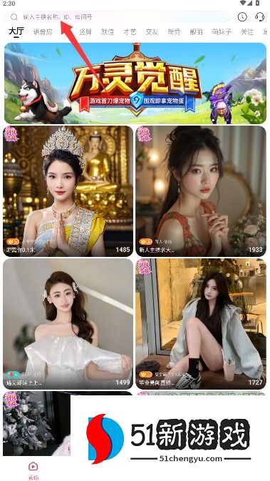 3、在首页导航栏的搜索框中输入特定主播的昵称或专属ID,即可检索到目标用户主页。