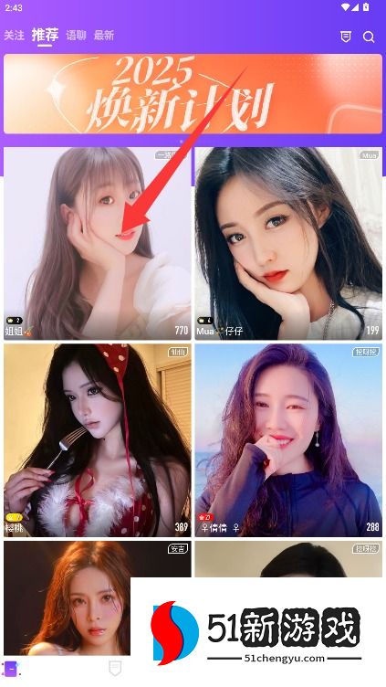 3、在推荐页面浏览系统精选的优质主播时,点击感兴趣的主播封面进入直播间。