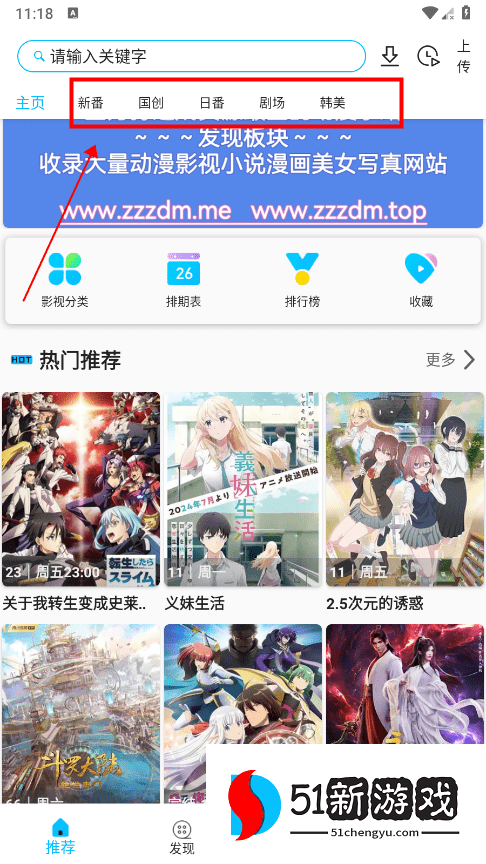 1、安装完成后,进入app,在主页,可以看到新番、国创、日番、剧场和韩美资源。