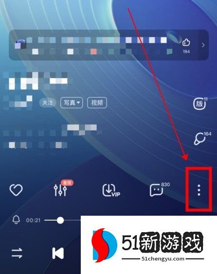 1.打开软件之后,点击播放歌曲,在歌曲的详情页中,点击下图所示右下角的三个点;