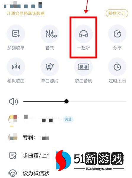 2.然后弹出一些功能选项,我们选择“一起听”功能,进入到详细设置界面;