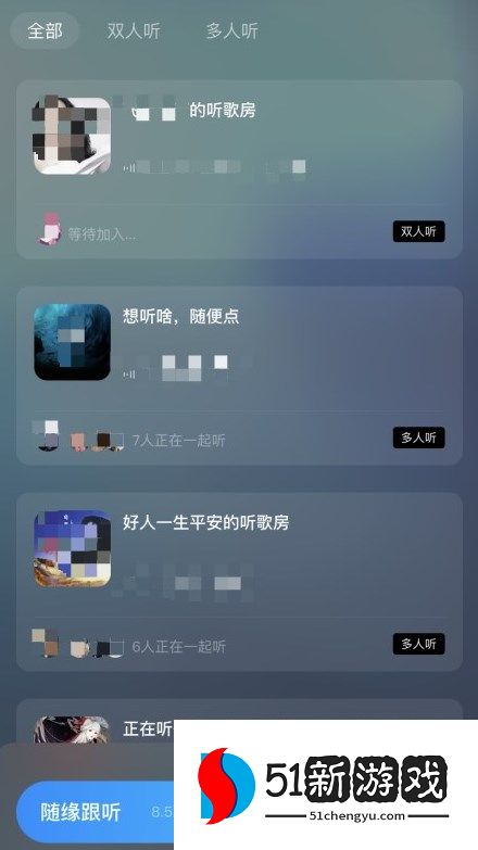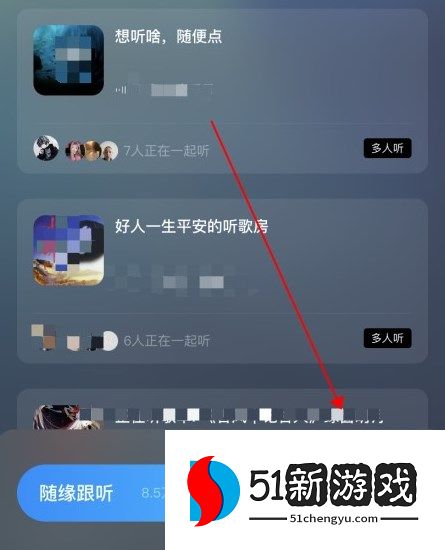 3.来到听歌房界面中之后,大家可以点击下面的“随缘跟听”,和其他用户一起听歌;