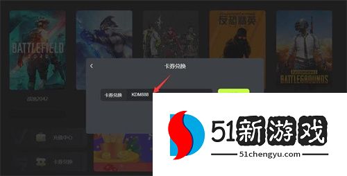 2.第二步:在卡券兑换对应的框中输入您获得的兑换码:【KDM888】,点击【兑换】按钮。