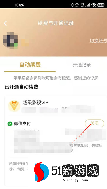 3.接着切换到自动续费这一栏,会显示目前开通了自动续费的项目,点击想要取消的会员,选择关闭自动续费即可。