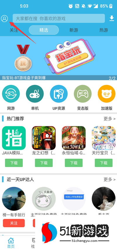 1、打开软天空APP进入到首页,点击左上角的头像图标;