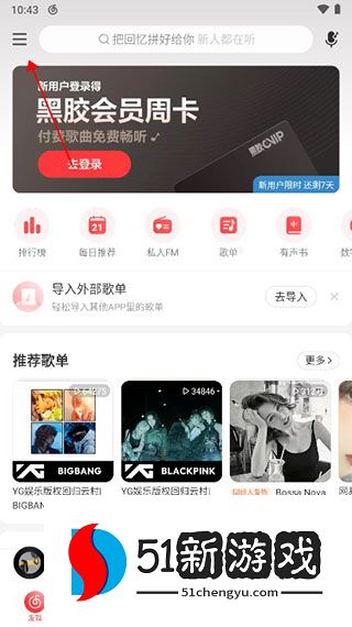1.打开网易云音乐来到首页,在界面左上角点击【三】按钮,下图所示;