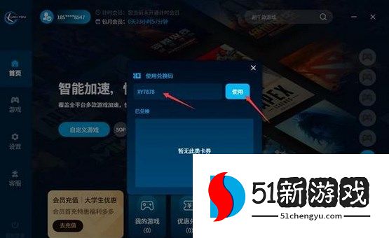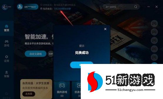3.如果兑换成功,会提示泫游7天加速时长卡兑换成功。如果兑换失败,则会提示【此账号已经使用过此福利码】。