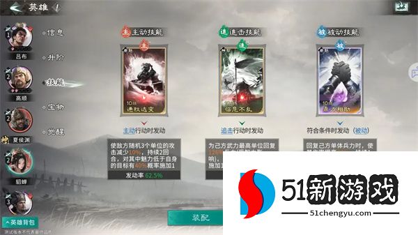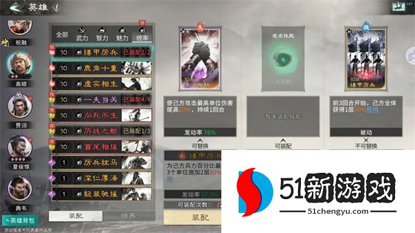 被动技能:推荐携带缮甲厉兵,前3回合开始,己方全体获得1层80%抵挡。可以大幅度提升我军前期的坦度。