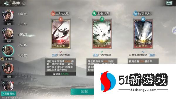主动技能:推荐携带万军取首,技能本身倍率不低,对上敌方残血兵力还能提高技能伤害,有着不错的收割效果。