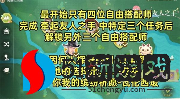 在初始阶段,地图上会有四位自由搭配师出现。玩家得逐个与他们对话并完成游说,成功游说后就能获取钻石奖励。而另外三位搭配师,则要通过完成“牵起友人之手”系列任务来解锁。