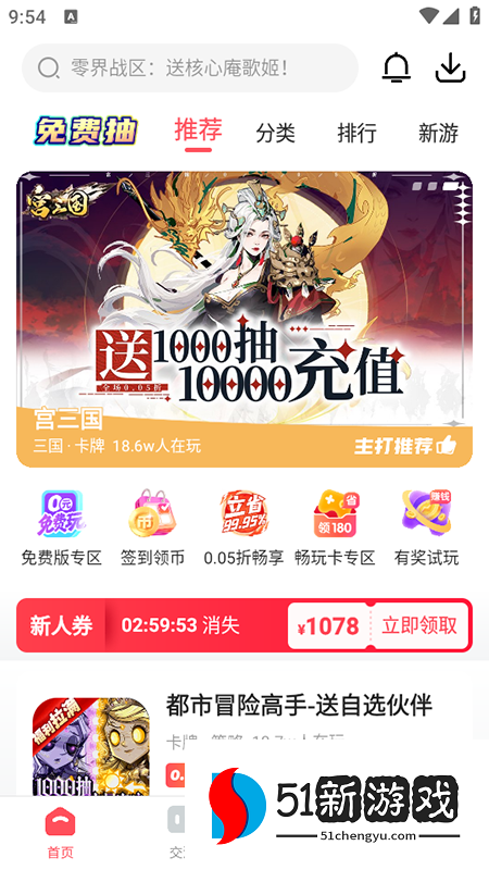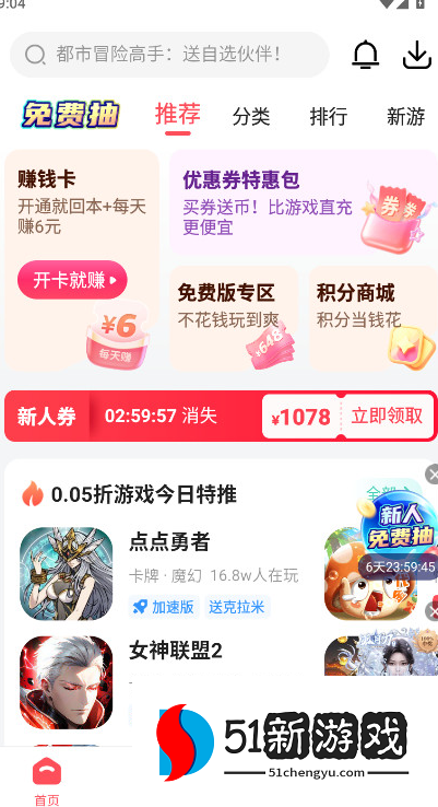 1、打开软件,在软件首页有不少推荐的游戏,也可以在分类按类型找喜欢的游戏,或者顶部搜索框中输入关键词找游戏。