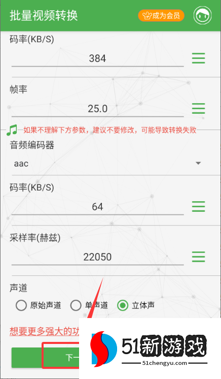 3、在转换设置页确认码率帧率等参数,点击下一步推进流程。