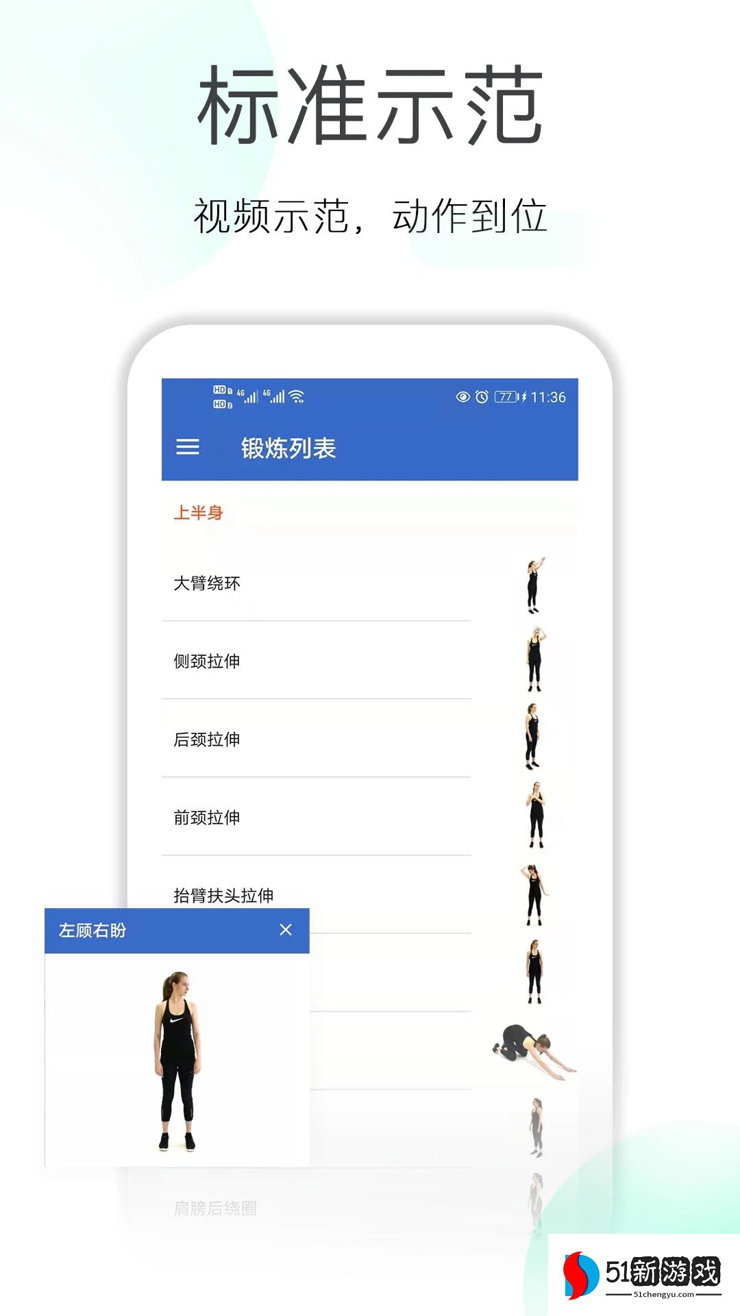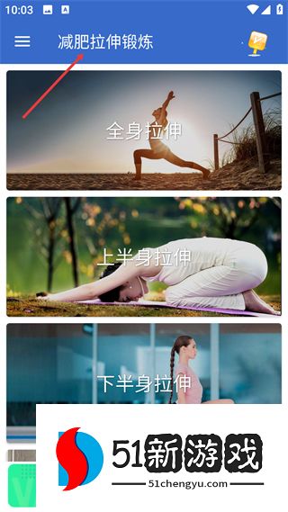 1、进入应用先到减肥拉伸锻炼主界面,可看到全身拉伸上半身拉伸下半身拉伸等选项,选择对应的拉伸类型,准备开启锻炼流程。