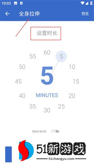 2、选择全身拉伸后进入设置时长页面,调整锻炼时长数值,可开启随机锻炼功能,确认后点击开始锻炼按钮进入锻炼环节。