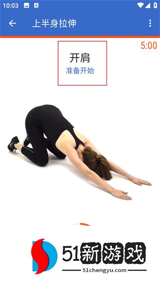 4、切换到上半身拉伸锻炼,会显示开肩准备开始的提示,跟随展示的动作进行练习,页面计时会实时记录该动作的持续时间。