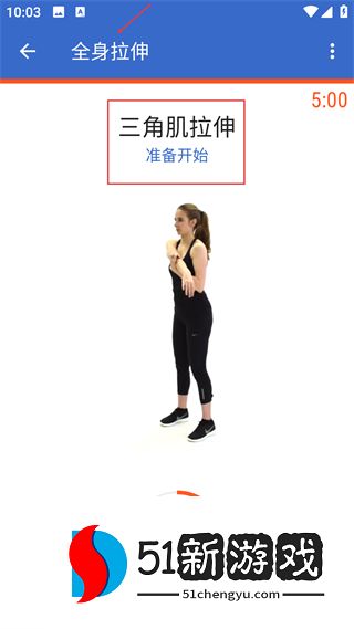 3、进入全身拉伸锻炼后,会显示三角肌拉伸准备开始的提示,跟随展示的动作完成锻炼,页面计时会同步记录动作时长。