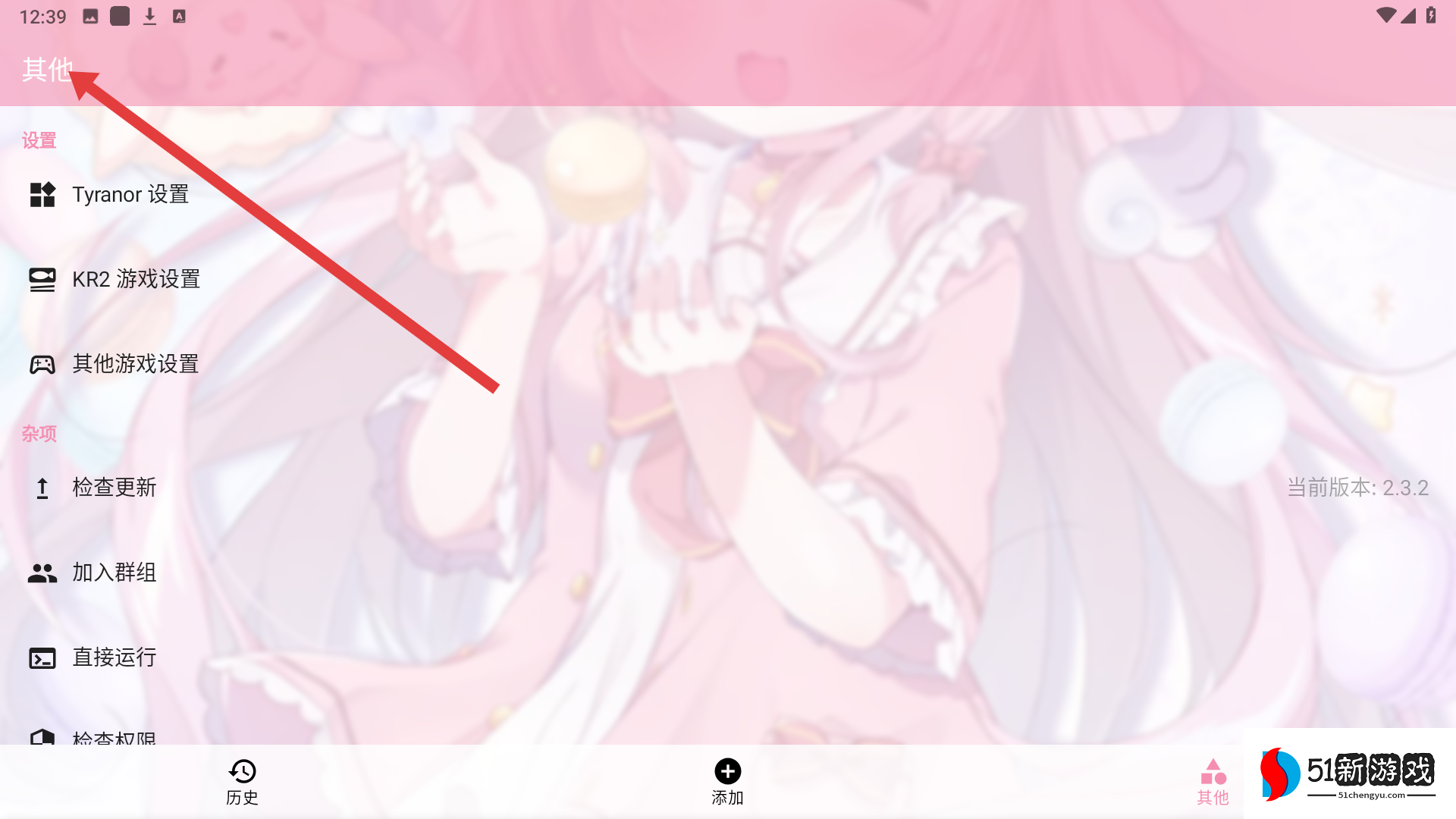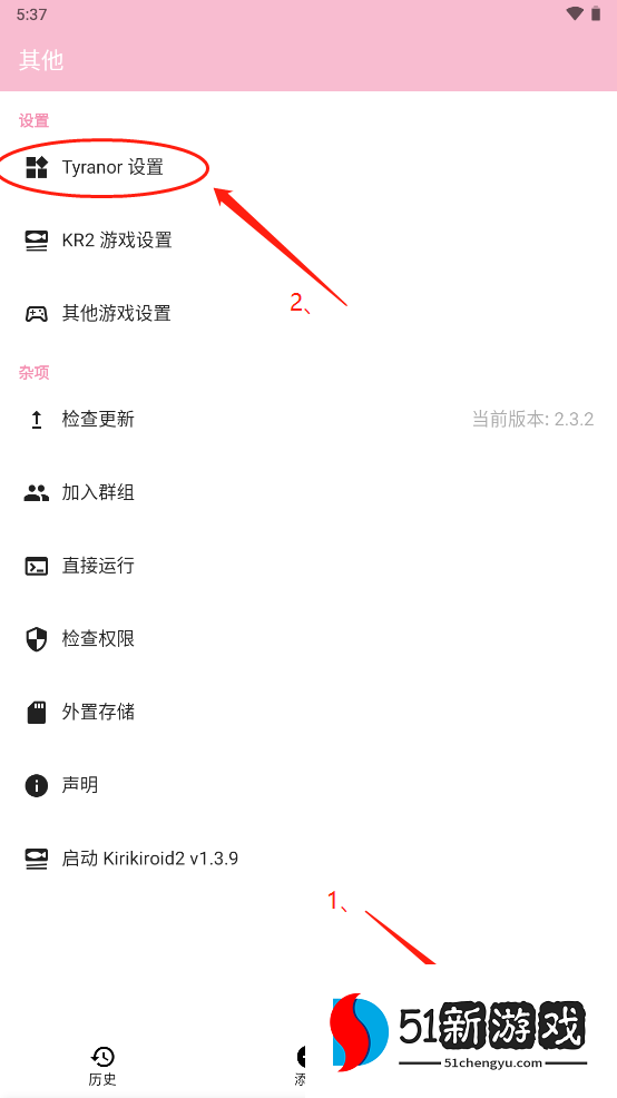 4、点击其他板块,可进入设置界面,查看Tyranor设置、KR2游戏设置等,还可进行检查更新、加入群组等操作,提升应用使用体验。