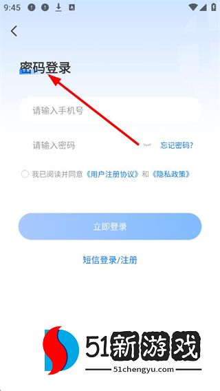 2、密码登录界面,需输入手机号和密码,勾选同意用户注册协议和隐私政策后点击立即登录,若忘记密码可点击对应选项找回,也可选择短信登录、注册方式。