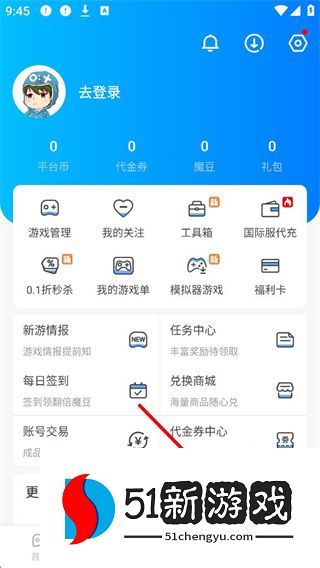 1、进入我的界面,可看到平台币、代金券等信息,还能使用游戏管理、我的关注、工具箱等功能,参与新游情报、每日签到等活动,享受账号交易等更多服务。