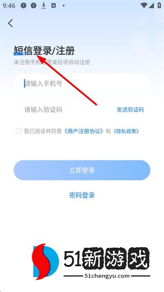 3、短信登录、注册界面,输入手机号并获取验证码,勾选同意相关协议后点击立即登录,未注册手机号登录后将自动注册,也可切换为密码登录方式。