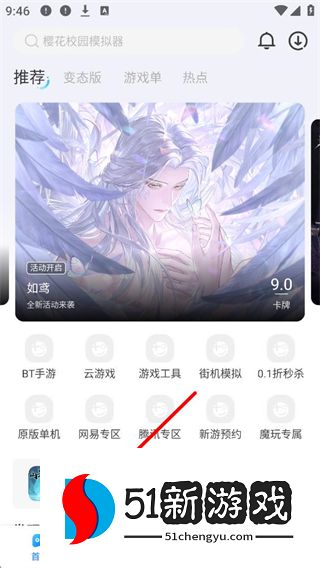 4、进入首页界面,可浏览推荐、变态版等分类游戏,查看如如鸢等游戏推荐,使用BT手游、云游戏等功能入口,了解山海试炼魔玩版等新游上线信息。