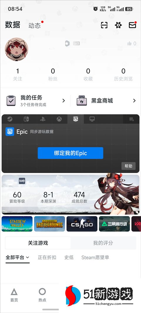 1、在手机应用商店搜索并安装“小黑盒”,打开app后点击底部“我”,选择Epic图标进入绑定页面。
