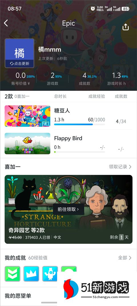 3、绑定后返回“我的”页面,点击Epic选项进入账号详情,选择“全部游玩游戏”即可查看库存。