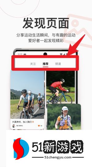 2、在“发现”页面,您可以浏览自行车和滑雪等运动爱好者发布的精彩更新。支持跟随、推荐和通道切换。