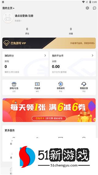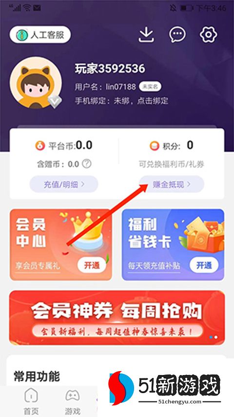 1、打开巴兔游戏盒子app,在【我的】界面,选择积分栏目下的“赚金抵现”选项。