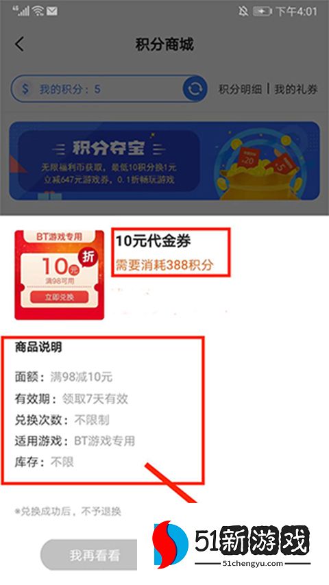 5、进入【积分商城】界面,在代金券兑换界面,选择需要的充值类型,这里以“10元代金券”为例,选择“立即兑换”选项。