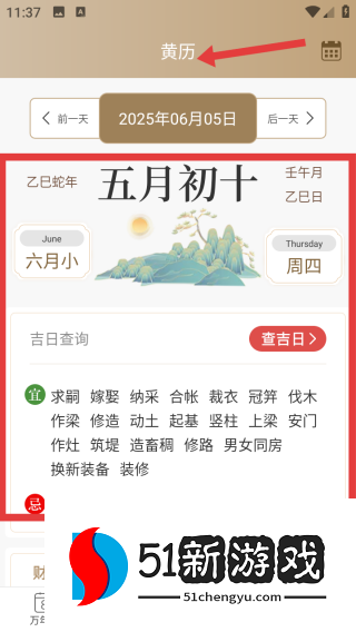 2. 年历页信息丰富,天干地支清晰,吉凶分明。景观插画增添了传统的韵味。查看吉日按钮,方便选择好时机。它帮助用户按照年历的习俗安排事务,让传统民俗辅助日常决策。