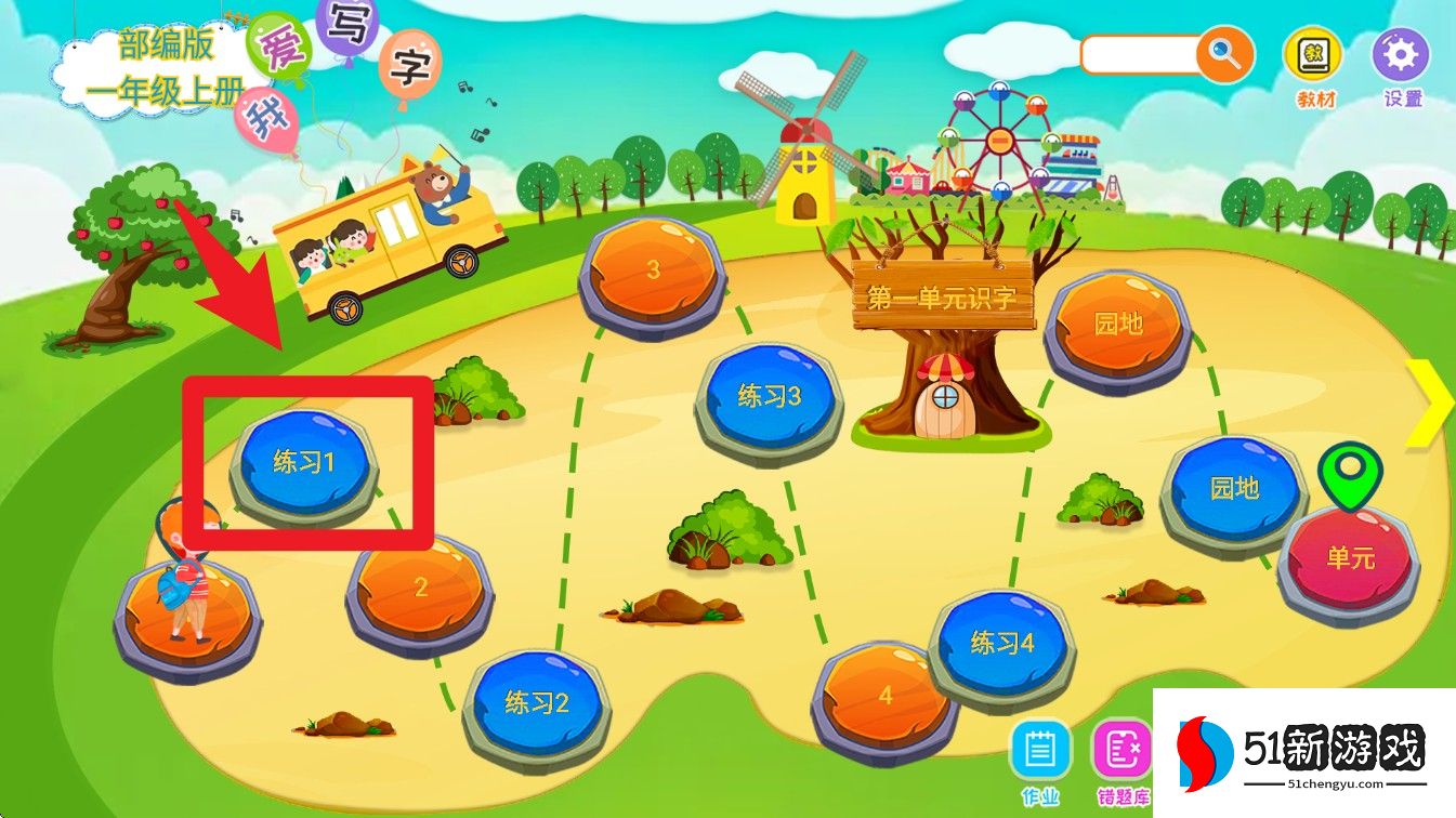 1、进入首页后,选择相应的年级章节,点击练习1等等级按钮,即可进入当前单元的学习任务。