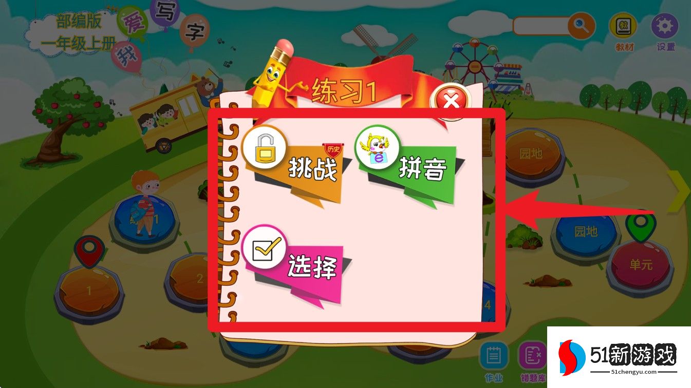 2、在弹出的任务页面中,选择拼音、选择等练习模式,按照图标进入具体的学习内容。