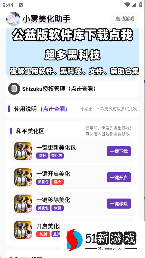 注意:开启美化防止启动游戏时意外闪退操作(移除美化→进入游戏,到游戏登录界面→ 退出游戏→回到"小雾美化助手"开启美化→重新进游戏即可完成美化!)(仅启动游戏出现需更新资源时执行的操作)。