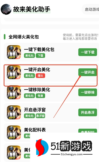 3、打开回到故来美化助手,点击“一键开启”,就能完成美化。