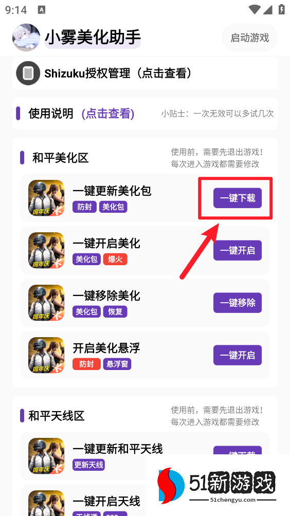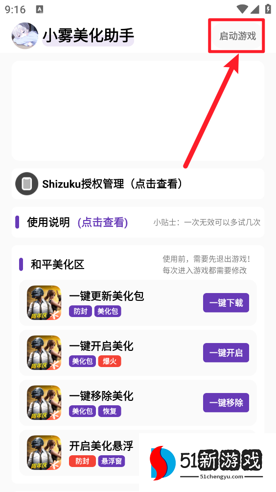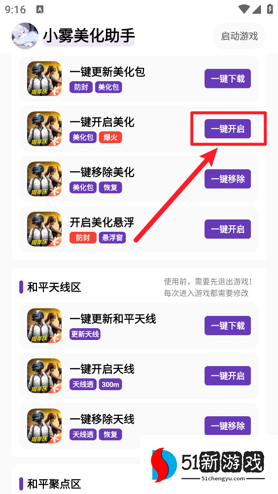 小贴士:开启美化防止启动游戏时意外闪退操作(移除美化→进入游戏,到游戏登录界面→ 退出游戏→回到"小雾美化助手"开启美化→重新进游戏即可完成美化!)(仅启动游戏出现需更新资源时执行的操作)