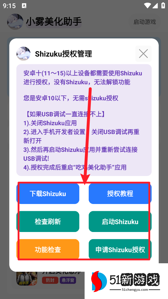 3、安卓十以上需要Shizuku授权,否则无法解锁功能。