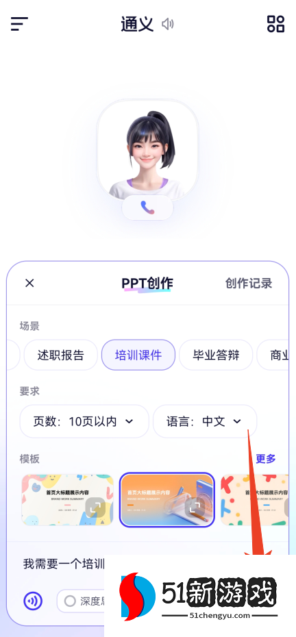 2、选择制作PPT的场景、页码、语言要求和模板。您也可以在输入框中输入更详细的要求和PPT主题。所有输入完成后,单击右下角。