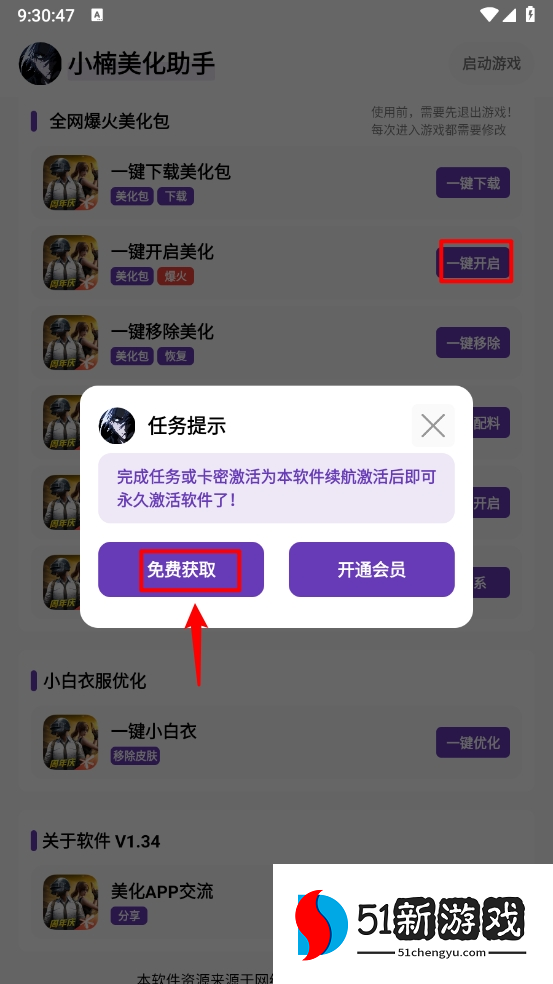 5、例如可以点击“一键开启美化”开关,在弹窗中点击“免费获取”。