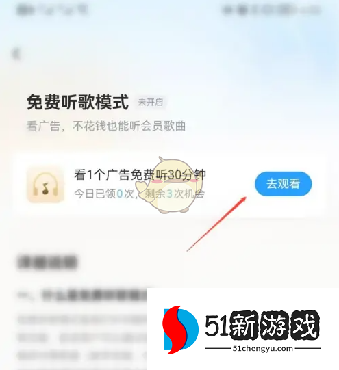 3、找到“看广告免费听30分钟”,点击“去观看”开启免费听会员歌曲模式。