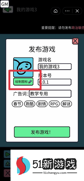 2、来到“发布游戏”页面,选择“绘制图标”。