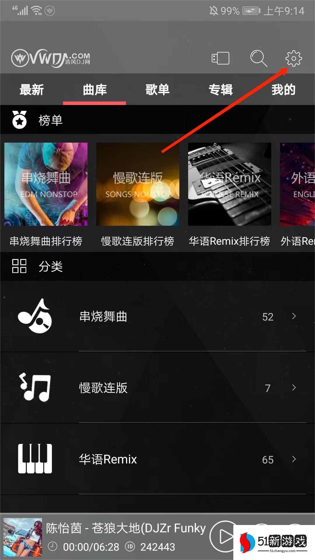 1、打开清风DJapp,进入主界面。选择右上角的齿轮图标。