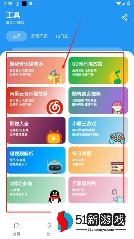 5、在工具页面,提供了影视大全、短视频解析、网易云音乐播放器等超多免费工具。