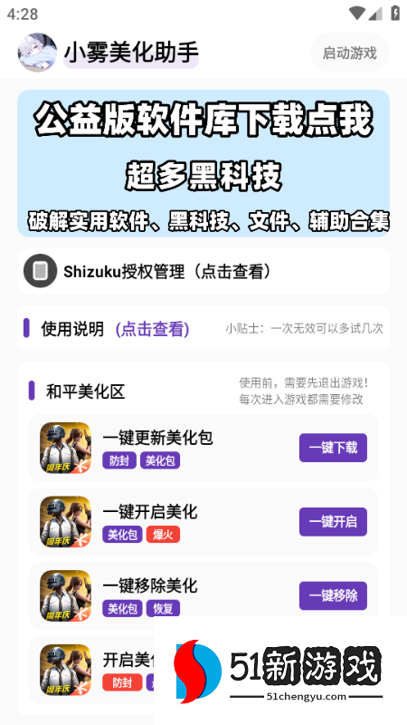 小贴士:开启美化防止启动游戏时意外闪退操作(移除美化→进入游戏,到游戏登录界面→ 退出游戏→回到"小雾美化助手"开启美化→重新进游戏即可完成美化!)(仅启动游戏出现需更新资源时执行的操作)