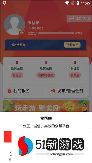 1、首先打开赏帮赚,点击下方我的按钮,注册登录。