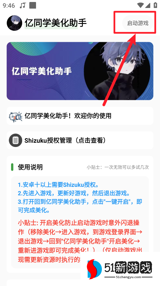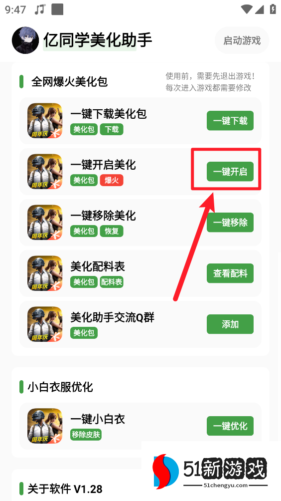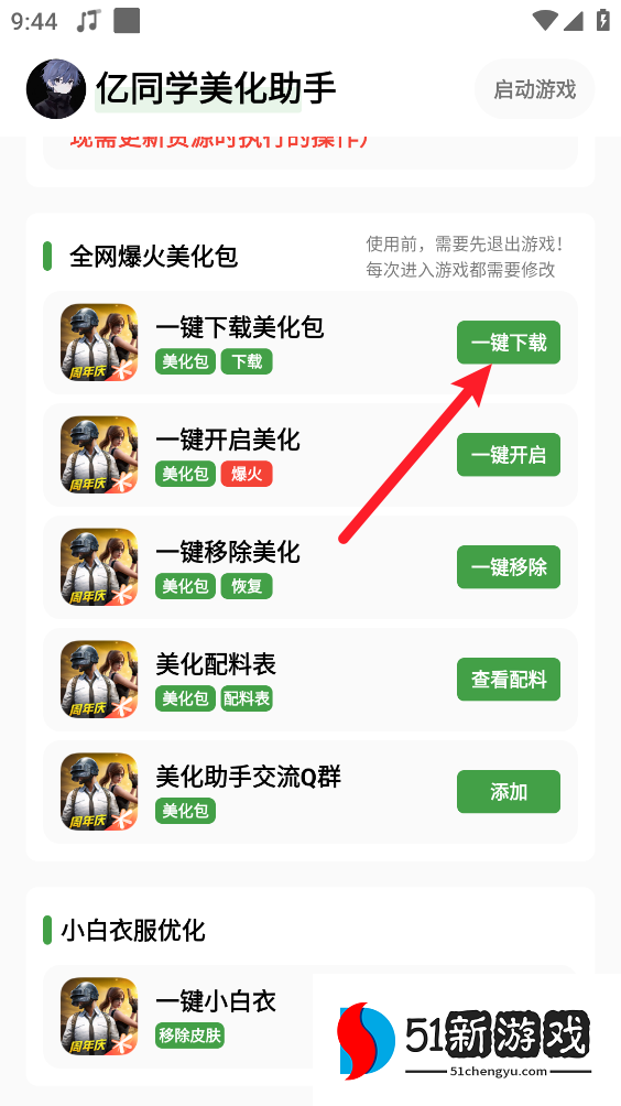 说明:开启美化防止启动游戏时意外闪退操作(移除美化→进入游戏,到游戏登录界面一退出游戏→回到"亿同学美化助手"开启美化→重新进游戏即可完成美化!)(仅启动游戏出现需更新资源时执行的操作)。