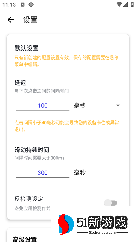 2、进入设置页面,根据需求设置延迟、滑动持续时间等参数,也可使用内置录制功能记录手指动作。