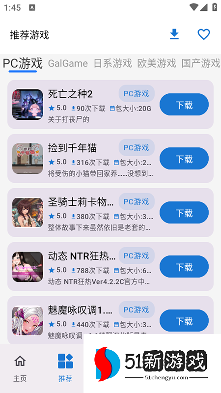 2、登录后进入首页,点击“推荐”,在展示的游戏资源中选择想要的游戏,点击“立即下载”即可开始下载。
