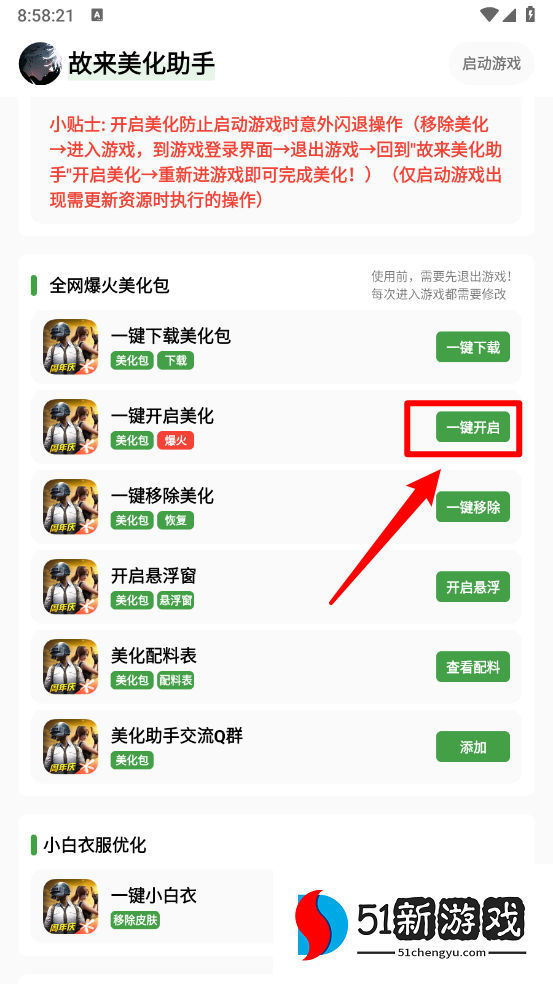 3、完成后向下滑动选择美化包,点击"一键开启"。