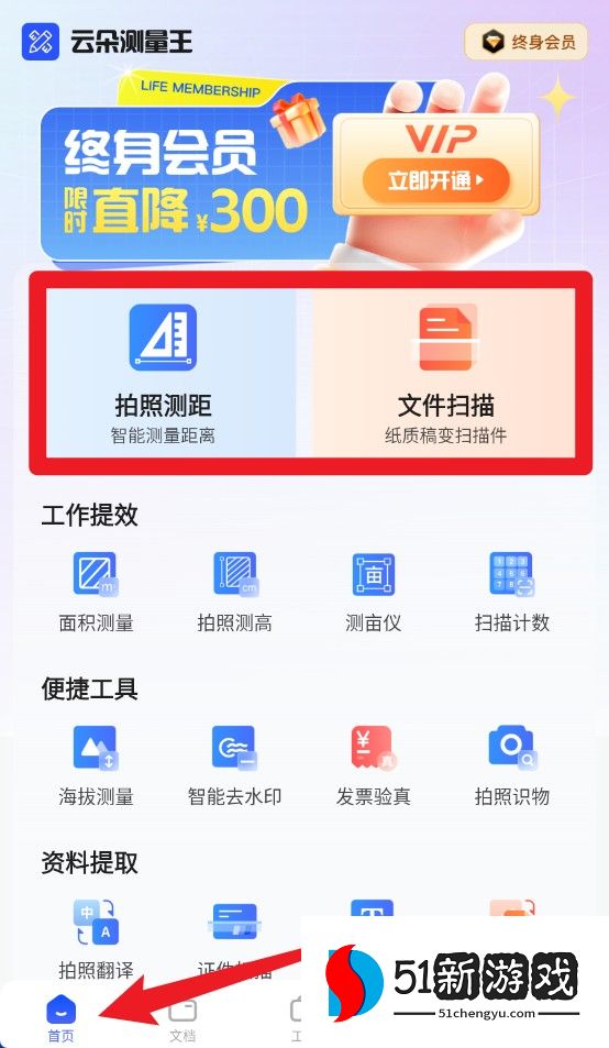1、进入主页后,您可以选择照片测距功能或文件扫描功能。前者用于测量物体之间的距离,而后者可以将纸质文件转换为电子文档。